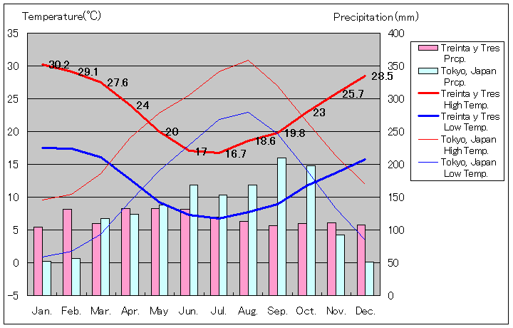 トレインタ・イ・トレス県トレインタ・イ・トレス月別気温(Temperature & Precipitation of Treinta y Tres, Treinta y Tres Department, Uruguay):トレインタ・イ・トレス県の県庁所在地となっている都市、人口 25,477人(2011年現在)、ウルグアイで 21番目に人口の多い街です。