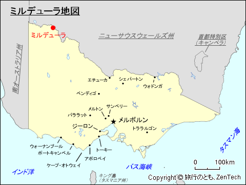 ビクトリア州の州都メルボルンからミルデューラまで飛行機で 1時間20分(直行便、3~8便/日)、車で 6時間(北西へ道なりで 550km)、ベンディゴから車で 4時間30分(北西へ道なりで 400km)です。