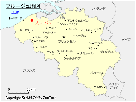 ベルギーの首都ブリュッセル からブルージュまで鉄道(IC)で 1時間5分、車で 1時間15分(北西へ道なりで 98km)、ヘント まで車で 43分(北西へ道なりで 48km)、コルトレイク から車で 40分(北へ道なりで 52.6km)です。ブルージュからオーステンデ まで車で 25分(西へ道なりで 27.4km)です。