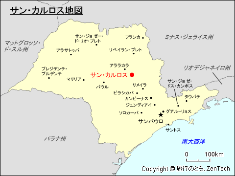 サンパウロ州におけるサン・カルロスの場所が判る地図