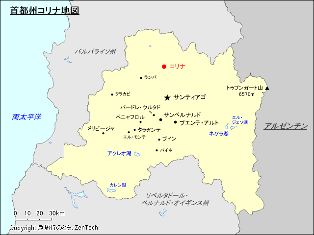 チリの首都サンティアゴからコリナまで車で 28分(北へ道なりで 33km)です。コリナからロス・アンデスまで車で 43分(北北東へ道なりで 48.5km)、サン・フェリーペまで車で 50分(北へ道なりで 57.5km)です。