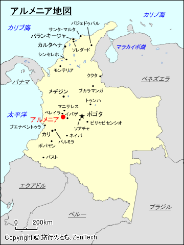 コロンビアの首都ボゴタからアルメニアまで車で 7時間50分(西へ道なりで 290km)、ヒラルドーから車で 4時間30分(西北西へ道なりで 160km)、イバゲから車で 3時間30分(西北西へ道なりで 92km)です。アルメニアからペレイラまで車で 1時間5分(北へ道なりで 46km)、カルタゴまで車で 1時間20分(北西へ道なりで 51km)、トゥルアから車で 1時間40分(南西へ道なりで 88km)です。