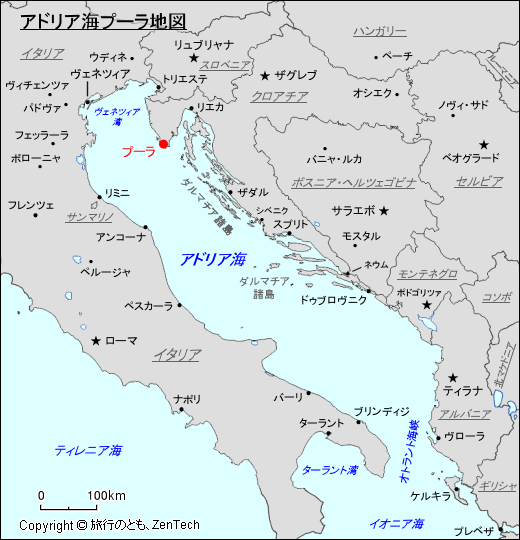 クロアチアにおけるプーラの位置が判る地図(Map of Pula, Republic of Croatia)