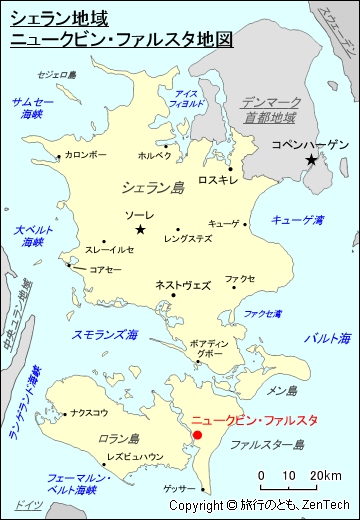シェラン地域におけるニュークビン・ファルスタの位置が判る地図