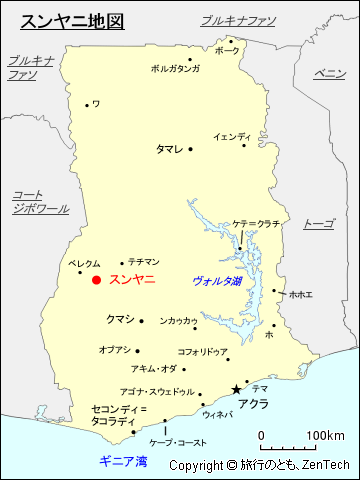 ガーナの首都アクラからスンヤニまで車で 7時間50分(北西へ道なりで 410km)、クマシから車で 2時間25分(北西へ道なりで 125km)です。スンヤニからテチマンまで車で 1時間25分(北東へ道なりで 65km)です。スンヤニからガーナ・コートジボワール国境を越えてコートジボワールのアベングルまで車で 3時間50分(西南西へ道なりで 190km)です。