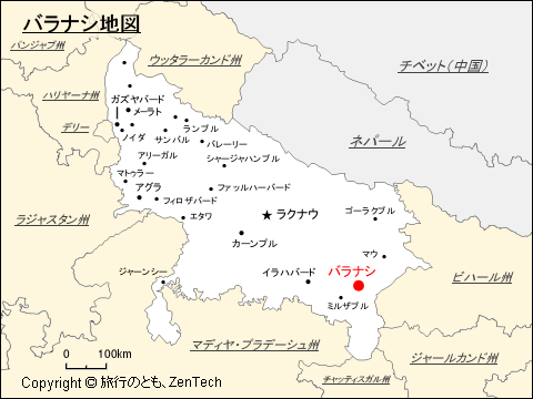 ウッタル・プラデーシュ州におけるバラナシの場所が判る地図
