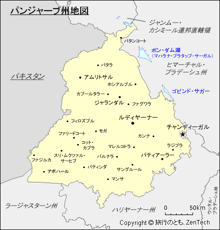 パンジャーブ州の周辺は、北西にパキスタンと陸続きで国境を接しています。北にジャンムー・カシミール連邦直轄領、北東から東にヒマーチャル・プラデーシュ州、南東から南にハリヤーナー州、南西にラージャスターン州が位置しています。