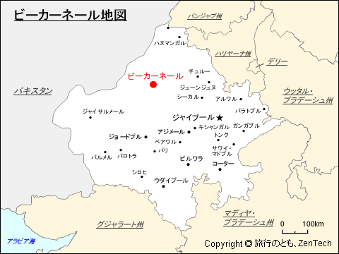 ラジャスタン州におけるビーカーネールの場所が判る地図