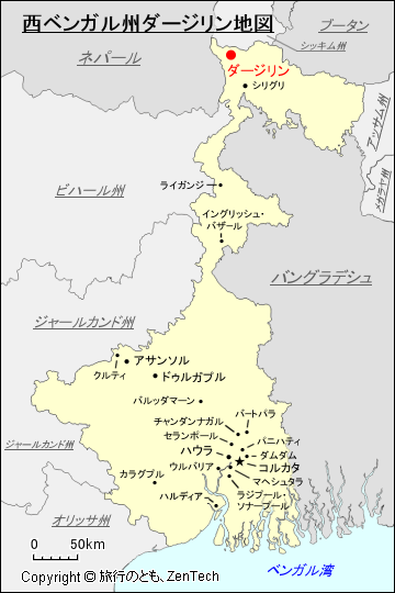 ダージリン(英語:Darjeeling, West Bengal)は、インド東部の西ベンガル州ダージリン県にある都市で、ダージリン県の県都(県庁所在地)となっている街です。紅茶の最高級品種とされる「ダージリン・ティー」の産地として世界的に知られています。ダージリンの人口は 118,805人(2011年現在)、西ベンガル州では 24番目に人口の多い街です。面積 7.43平方キロメートル(2.87平方マイル)、海抜 2,045メートル(6,709フィート)、北緯 27度02分15秒 東経 88度15分47秒です。