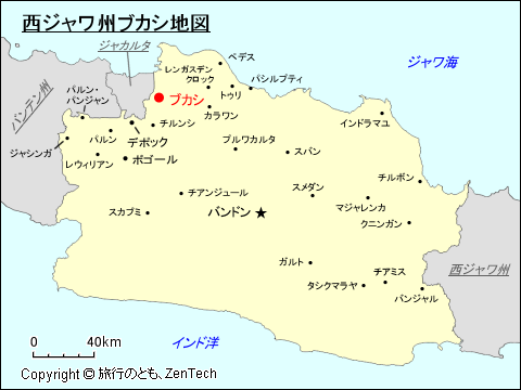 インドネシアの首都ジャカルタからブカシまで車で 44分(東へ道なりで 26km)です。ブカシからバンドンまで車で 2時間50分(南東へ道なりで 135km)です。