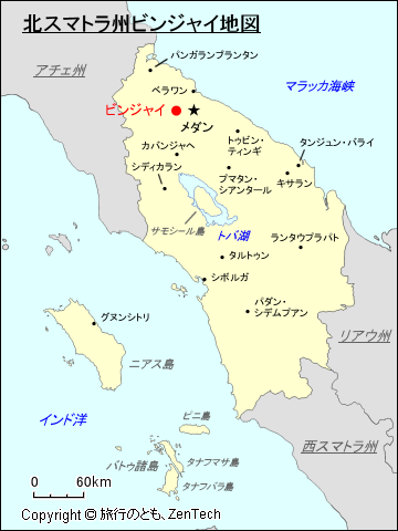 北スマトラ州におけるビンジャイの位置が判る地図