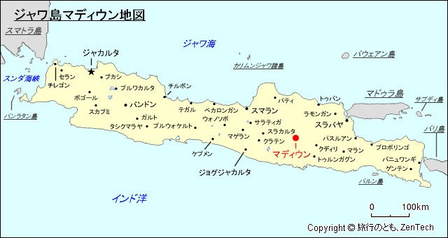 インドネシアにおけるマディウンの位置が判る地図(Map of Madiun, Java Island, Indonesia)
