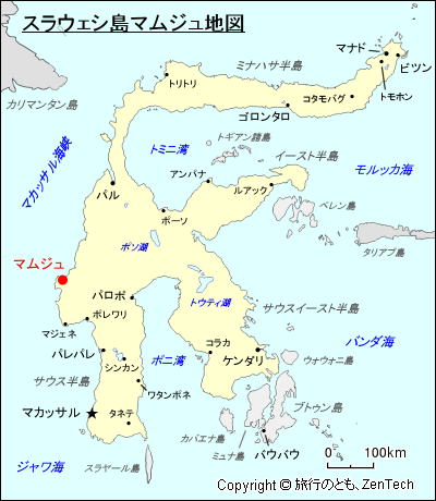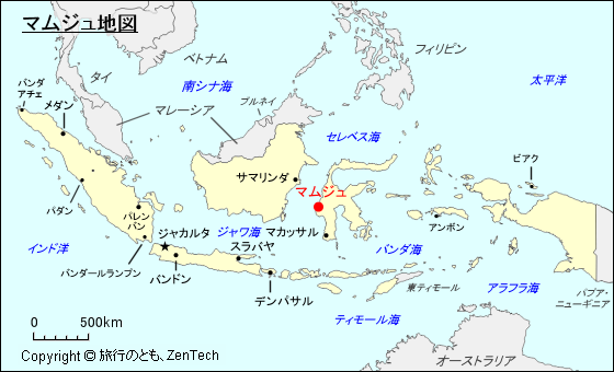西部の西スラウェシ州にある都市で、西スラウェシ州の州都となっている街です。スラウェシ島西岸中部に位置する港町です。マムジュの人口は 107,864人(2010年現在)、西スラウェシ州の最大都市です。海抜 390メートル(1,280フィート)、南緯 2度40分07秒 東経 118度51分44秒です。