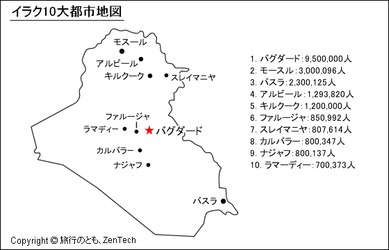 | 1 | バグダード | Baghdad | بغداد | 9,500,000人 | バグダード県 |
