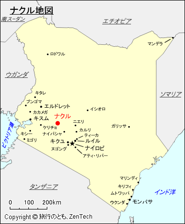 ケニアの首都ナイロビからナクルまで車で 2時間55分(北西へ道なりで 170km)、ナイバシャから車で 1時間25分(北西へ道なりで 71km)です。ナクルからエルドレットまで車で 2時間55分(北西へ道なりで 156km)、キスムまで車で 3時間25分(西へ道なりで 185km)です。