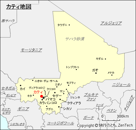 カティ(フランス語:Kati)は、マリ南西部のクリコロ州カティ圏にある都市で、カティ圏の首府となっている街です。首都バマコ近郊北西に位置する街です。カティの人口は 114,983人(2009年統計)、クリコロ州ではカラバンコロに次いで 2番目、マリ全体では 7番目に人口の多い街です。海抜 481メートル、北緯 12度44分48秒 西経 8度04分17秒です。