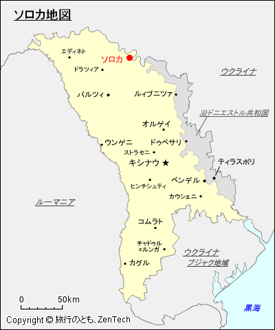 モルドバの首都キシナウ からソロカまで車で 2時間25分(北北西へ道なりで 160km)、バルツィ から車で 1時間20分(北東へ道なりで 84km)です。ソロカからエディネトまで車で 1時間35分(西へ道なりで 98km)です。ソロカからモルドバ・ウクライナ国境を越えてウクライナのヴィーンヌィツャ まで車で 2時間45分(北へ道なりで 145km)です。