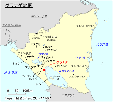 ニカラグア国内では、首都マナグア からグラナダまで車で 57分(南東へ道なりで 43km)、マサヤ から車で 23分(東南東へ道なりで 18km)です。グラナダからリバス まで車で 1時間15分(南南東へ道なりで 70km)、フイガルパまで車で 1時間45分(東北東へ道なりで 93km)、ブルーフィールズ まで車で 6時間5分(東へ道なりで 320km)です。