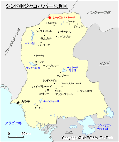 パキスタンにおけるジャコババードの場所が判る地図(Map of Jacobabad, Sindh province, Pakistan)