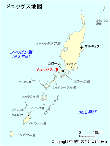 パラオの最大都市コロールからメユッグスまで車で 8分(西北西へ道なりで 4.8km)です。メユッグスからロマン・トメトゥチェル国際空港(パラオ国際空港)まで車で 21分(東北東へ道なりで 13.9km)、首都マルキョクまで車で 47分(北東へ道なりで 40km)です。