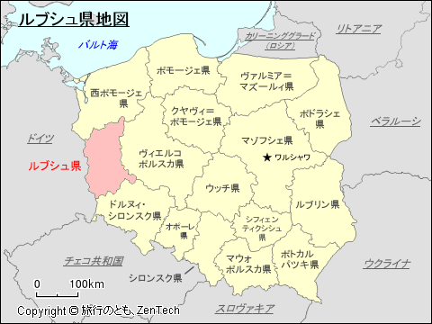 ポーランド西部にあるルブシュ県の地図です。ルブシュ県(ポーランド語:Lubuskie、英語:Lubusz Voivodeship(Lubuskie Province))の県庁所在地はゴジュフ・ヴィエルコポルスキ、県議会所在地はジェロナ・グラです。人口は 1,023,000人、面積は 13,984平方キロメートルです。