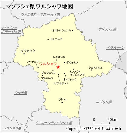 マゾフシェ県におけるワルシャワの位置が判る地図