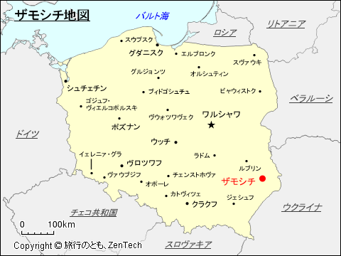 ザモシチへの交通アクセスは、ポーランドの首都ワルシャワからザモシチまで車で 3時間5分(南東へ道なりで 265km)、ルブリン県の県都ルブリンまで車で 1時間20分(南東へ道なりで 87km)、ヘウムから車で 1時間5分(南南西へ道なりで 57.5km)です。 ザモシチからフレベンネ(ポーランド・ウクライナ国境のポーランド側の街)まで車で 1時間(南東へ道なりで 60km)です。ザモシチからポーランド・ウクライナ国境を越えてウクライナのリヴィウまで車で 2時間30分(南東へ道なりで 130km)です。