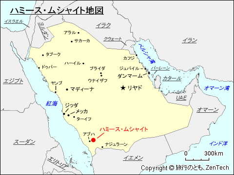 サウジアラビアにおけるハミース・ムシャイトの位置が判る地図