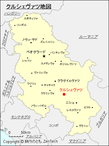 セルビアにおけるクルシェヴァツの位置が判る地図