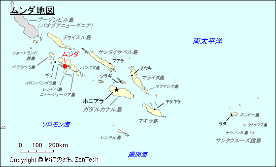 ムンダ(英語:Munda, Solomon Islands)は、ソロモン諸島の西部州ニュージョージア島にある都市です。ムンダの人口は 2,843人(2009年国勢調査)、西部州では州都ギゾとノロに次いで 3番目ソロモン諸島では 7番目に人口の多い街です。南緯 8度19分41秒 東経 157度16分15秒です。