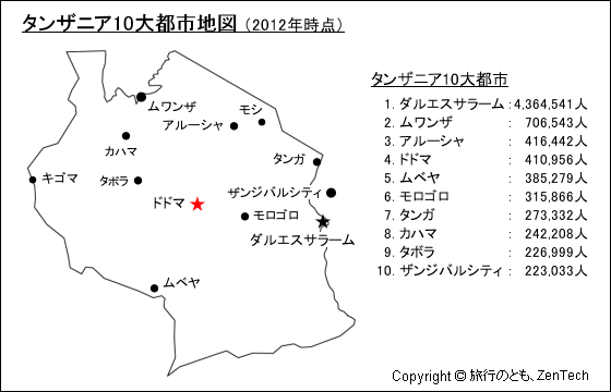 タンザニア10大都市地図(10 Largest Cities Map of Tanzania)、2012年時点