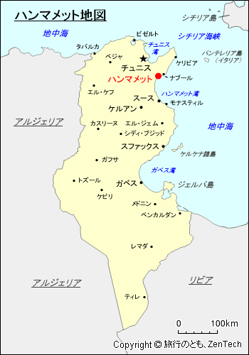 チュニジアにおけるハンマメットの場所が判る地図(Map of Hammamet, Nabeul Governorate, Tunisia)