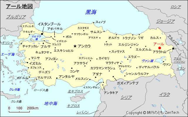 アール(トルコ語:Ağrı、英語:Agri, Turkey)は、トルコ共和国東部の東アナトリア地方アール県にある都市で、アール県の県都(県庁所在地)となっている街です。アールの人口は 99,276人(2015年現在)、アール県の最大都市、トルコ全体では 70番目に人口の多い街です。