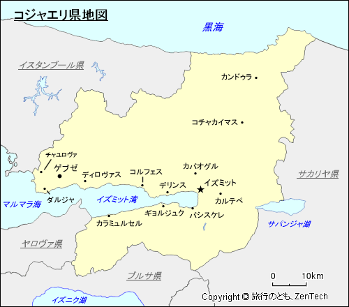 コジャエリ県の周辺は、北西はイスタンブール県、南西はヤロヴァ県、南はブルサ県、東はサカリヤ県と隣接しています。北は黒海、西はマルマラ海とイズミット湾(マルマラ海東端に東西に伸びる細長い湾)に面しています。