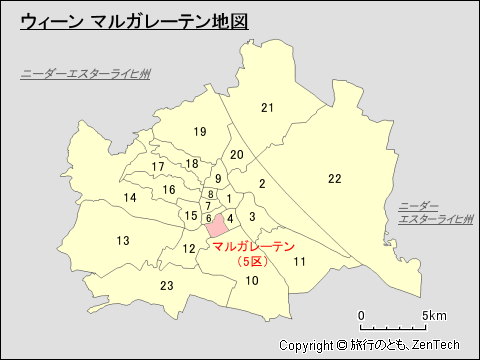 マルガレーテン区(ドイツ語:Margareten, Wien、通称:ウィーン 5区)は、オーストリア の首都ウィーン を構成する23の行政区(Gemeindebezirk)の一つで、ウィーン中心部の南隣近くに位置する区です。マルガレーテンの人口は 54,940人(2016年1月1日現在、2001年時点では人口 49,111人、2001年時点では労働人口(昼間の人口) 14,964人)、ウィーンでは 15番目に人口の多い区です。面積 2.03平方キロメートル(0.78平方マイル)、ウィーンでは 19番目に面積の大きい区です。マルガレーテン区内は、フントシュトゥルム、ラウレンツァーグルント、マルガレーテン、マッツラインスドルフ、ニコルスドルフ、ラインプレヒツドルフから構成されています。