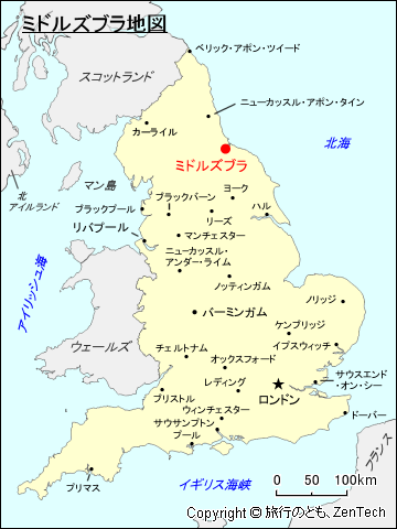 イギリスにおけるミドルズブラの位置が判る地図