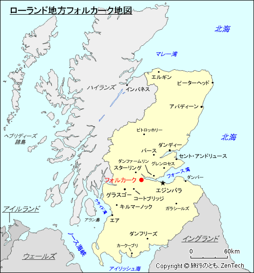 スコットランド地方のフォルカークの地図です。フォルカークをはじめとした主要都市の場所が判り、フォルカークへの旅行や周辺都市の場所を知るのに役立ちます。多くの場合記載されている日本語表記の都市は、インターネットによるホテル予約が可能です。