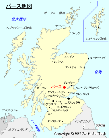 パースへの交通アクセスは、スコットランドの首都エジンバラ からパースまで車で 58分(北北西へ道なりで 44マイル)、グラスゴー から車で 1時間5分(北東へ道なりで 59.5マイル)、キンロス から車で 25分(北へ道なりで 17.3マイル)です。パースからダンディー まで車で 29分(東北東へ道なりで 21.8マイル)、インバネス まで車で 2時間10分(北北西へ道なりで 112マイル)です。