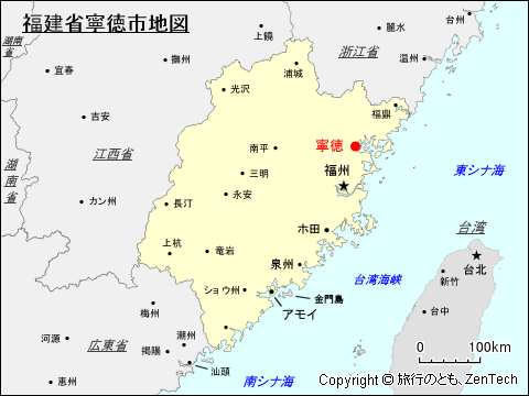 福建省の省都・福州から寧徳まで車やバスで 1時間40分(北へ道なりで 105km)です。寧徳から福鼎を経由して浙江省温州市まで車やバスで 3時間15分(北東へ道なりで 235km)です。
