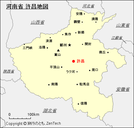 許昌市(きょしょう し、シューチャン シ、中国語簡体字:许昌市(Xǔchāng Shì)、英語:Xuchang city, Henan)は、中華人民共和国・華北地方の河南省にある都市(地級市)です。市政府所在地は魏都区(Weidu District)です。許昌の人口は 4,379,998人(2020年現在、2010年時点では人口 4,307,199人)、河南省では 12番目に人口の多い街です。面積 4,978平方キロメートル(1,922平方マイル)、北緯 34度02分13秒 東経 113度51分07秒です。許昌の下位行政区画は、2市轄区2県級市2県で構成されています。