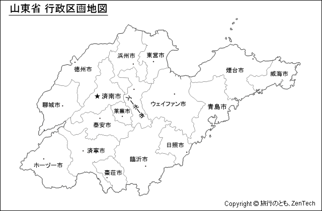 副省級市は、省会(省都)となっている済南市と青島市です。地級市は、浜州市と徳州市と東営市と菏沢市(ホーヅー市)と済寧市と莱蕪市と聊城市と臨沂市と日照市と泰安市と濰坊市と威海市と煙台市と棗荘市および淄博市(ズーボー市)です。