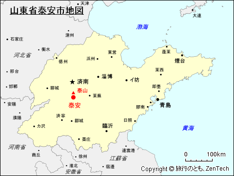 山東省の省都済南市から泰安市まで車やバスで 1時間25分(南へ道なりで 90km)です。泰安から莱蕪区(旧莱蕪市)まで車やバスで 1時間5分(東へ道なりで 56km)、済寧市まで車やバスで 2時間5分(南西へ道なりで 140km)、聊城市まで車やバスで 1時間50分(西北西へ道なりで 135km)、臨沂市まで車やバスで 2時間30分(南東へ道なりで 195km)です。