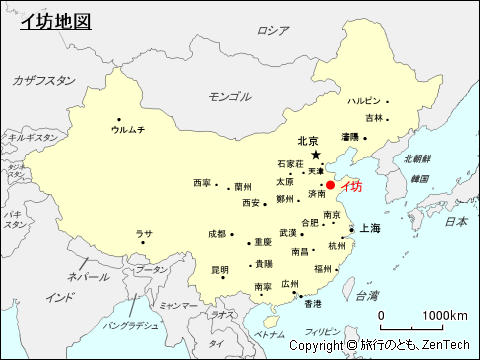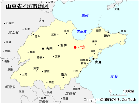 濰坊市(イ坊市、いぼう し / ウェイファン シー、中国語簡体字:潍坊市(Wéifāng)、繁体字:濰坊市、英語:Weifang City, China、略称は「潍(濰)」、旧称は「潍州」「潍县」)は、中華人民共和国・華東地方の山東省中部東寄りにある都市(地級市)です。濰坊市の下位行政区画は、4市轄区、6県級市、2県で構成されています。市轄区は奎文区(Kuiwen District)・濰城区・坊子区・寒亭区、県級市は寿光市・諸城市・青州市・安丘市・高密市・昌邑市、県は昌楽県・臨朐県(臨ク県)です。総面積 16,143.14平方キロメートル(6,232.90平方マイル)、市区面積 2,646.1平方キロメートル(1,021.7平方マイル)、海抜 32メートル(106フィート)、北緯 36度42分29秒 東経 119度09分43秒です。