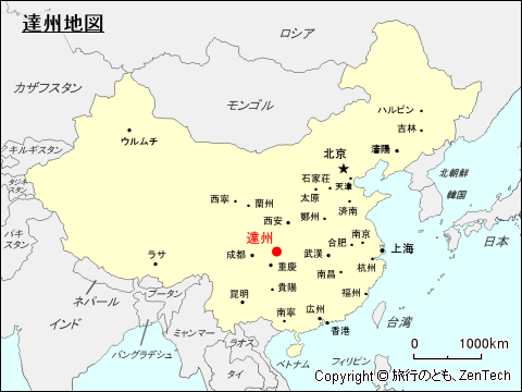 中国の首都・北京市 から達州まで飛行機(直行便、1便/日)で 2時間50分、上海市 から達州まで飛行機(直行便、3 便/週)で 2時間55分、広州から飛行機(直行便、1便/日)で 2時間20分、深センから飛行機(直行便、1便/日)で 2時間10分、昆明から達州まで飛行機(直行便、1便/日)で 1時間35分です。達州から甘粛省の西安まで車で 7時間5分(北東へ道なりで 500km)、達州から重慶市まで車で 2時間50分(南西へ道なりで 230km)です。