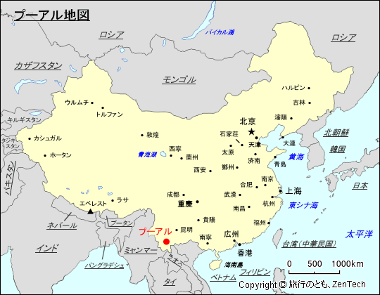 プーアル市(普洱市(普ジ市)、ふじ し / プーアル シー、中国語簡体字:普洱市、英語:Pu'er City, China)は、中華人民共和国 ・西南部の雲南省 にある地級市です。雲南省の南部に位置し、北は大理ペー族自治州と楚雄イ族自治州、東は玉渓市と紅河ハニ族イ族自治州、南東はベトナムとラオス、南はシーサンパンナ・タイ族自治州、南西はミャンマー、西は臨滄市に接しています。東南アジアの国々と隣接し、古くから周辺国との交易で栄えた街で、清代の1896年(光緒22年)に税関が設けられ雲南三大税関の一つに数えられていました。「プーアル茶」産地として知られ、近年ではコーヒー栽培も行われています。プーアル市の下位行政区画は、1市轄区、9自治県で構成されています。市轄区は思茅区、自治県は寧洱ハニ族イ族自治県・鎮沅イ族ハニ族ラフ族自治県・景東イ族自治県・景谷タイ族イ族自治県・墨江ハニ族自治県・西盟ワ族自治県・孟連タイ族ラフ族ワ族自治県・瀾滄ラフ族自治県・江城ハニ族イ族自治県です。総人口(地級市全体) 2,542,898人(2010年現在)で、雲南省では昆明に次いで 8番目に人口の多い都市です。