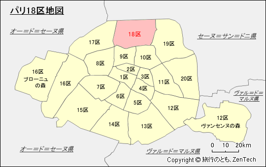 パリ18区(フランス語:18e arrondissement de Paris(La Butte-Montmartre(ラ・ビュット・モンマルトル))、英語:18th, Paris、XVIII)は、フランス共和国の首都パリにある行政区で、パリ市北部(セーヌ川右岸)に位置しています。18区の人口は 192,468人(2019年1月現在)、パリでは15区と20区に次いで 3番目に人口の多い区です。面積 6.01平方キロメートルです。北緯 48度53分32秒 東経 2度20分40秒です。18区は、グランド=カリエール地区(69 - Quartier Grandes-Carrières)、クリニャンクール地区(70 - Quartier de Clignancourt)、グット=ドール地区(71 - Quartier de la Goutte-d'Or)、ラ・シャペル地区(72 - Quartier de La Chapelle)の4つの地区(カルチェ)から構成されています。