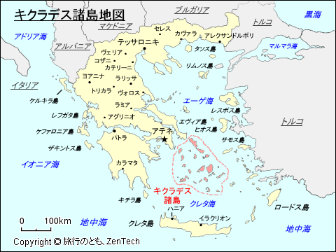 ギリシャにおけるキクラデス諸島の位置が判る地図