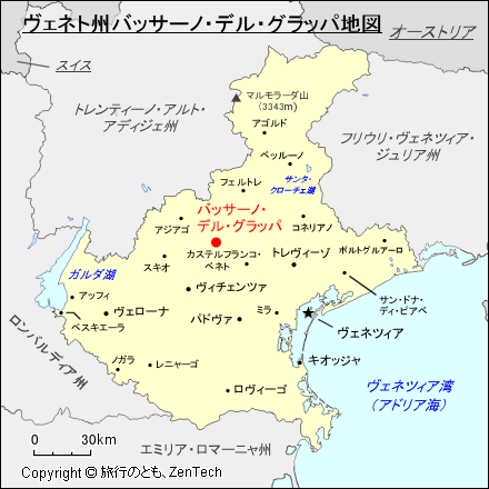 | 2.ガリバルディ広場 / Piazza Garibaldi:バッサーノ・デル・グラッパの中心広場、広場に面して観光案内所(Ufficio Informazioni Turistiche Bassano del Grappa)、市立博物館(Museo Civico)、サン・フランチェスコ教会(Chiesa di San Francesco)、市の塔(Torre Civica)があります。 |