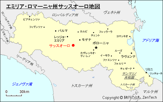 エミリア・ロマーニャ州におけるサッスオーロの位置が判る地図(Map of Sassuolo, Emilia-Romagna Region, Italy)