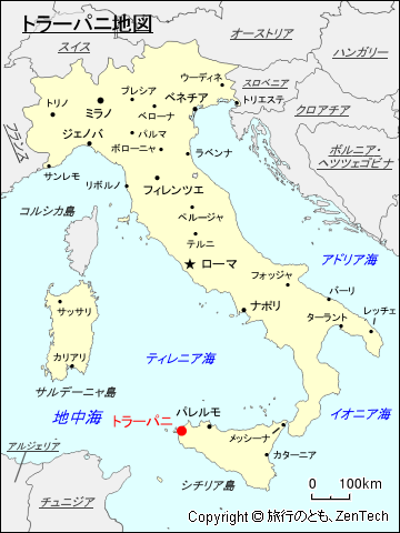 | 3. ヴィンツェンツォ・フローリオ空港(トラーパニ空港) / Vincenzo Florio Airport Trapani–Birgi:軍民共用空港、シチリア島で3番目に旅客の多い空港(1,586,992人 = 2015年)、民間機は主に格安航空会社が就航、トラーパニ市街から空港まで車で20分(南南西へ道なりで18キロメートル)、地図外左下 |